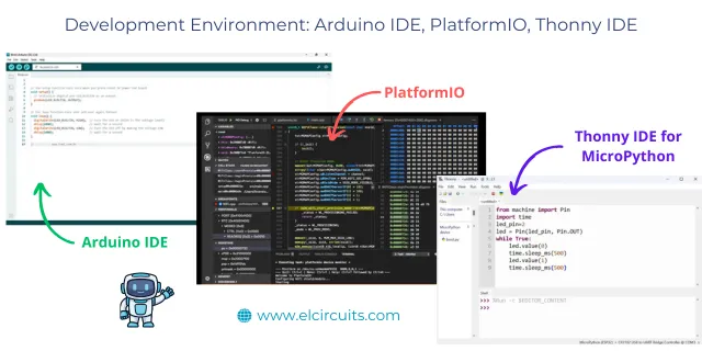 Arduino IDE (left), PlatformIO (center) and Thonny for MicroPython (right)