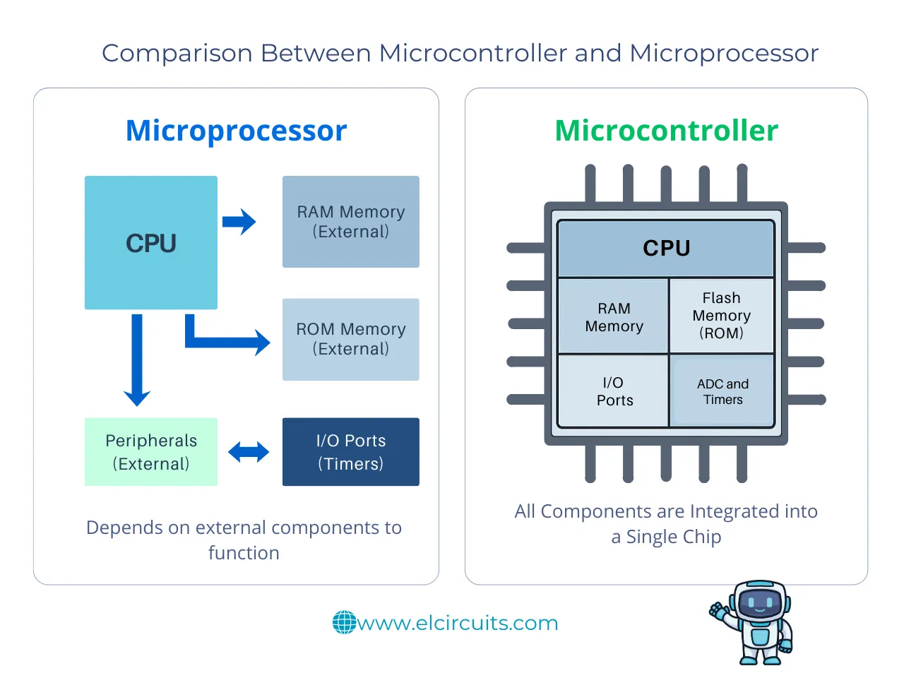 While microcontrollers have integrated memory and peripherals (like ADCs and GPIOs), microprocessors depend on external components. This is why microcontrollers are ideal for embedded and IoT projects.