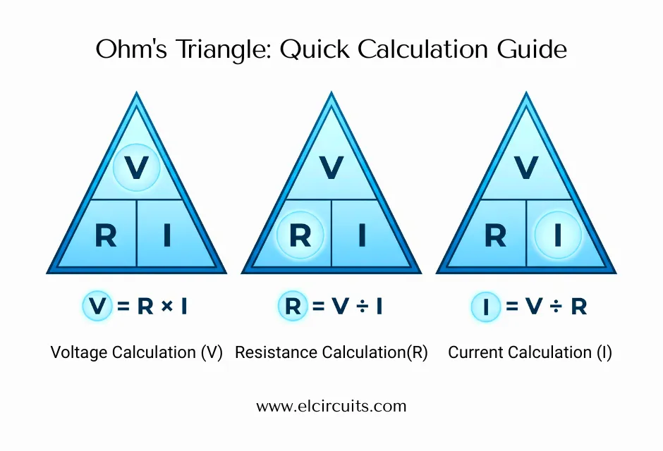 The magic happens here: cover the letter representing the Voltage (V), Resistance (R), or Current (I) you want to find in the triangle, and the position of the other two will show you the formula to use.